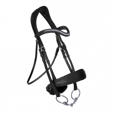 The Makila snaffle bridle has a broad, ergonomic headpiece integrating all cheek piece components to make your horse more comfortable. The headpiece boasts an opening at the nape to free the nuchal ligament. The browband features elastic loops that make contact with the temporal bone, minimizing pressure while also improving the accuracy of its position. The throat lash and noseband can be adjusted on both sides providing perfect balance and effortless adjustment. The broad noseband features an opening at the corner of the mouth for optimal use of the snaffle bit. It is also equipped with a broad, thick flash that perfectly supports the lower jaw.