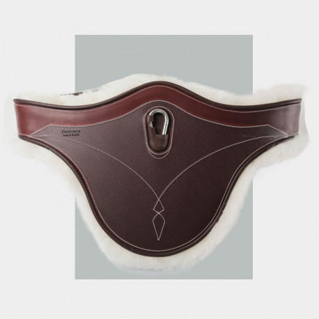 La sangle bavette mouton amovible est légèrement incurvée pour épouser parfaitement la morphologie de la cage thoracique du cheval. Composée de cuir grainé sur sa partie centrale, elle assure une protection efficace contre les atteintes des crampons. Sa doublure en mouton naturel est conseillée pour les chevaux à la peau fragile et sujets aux blessures dues aux frottements. Les dés latéraux et le mousqueton central permettent la fixation rapide des colliers et enrênements.